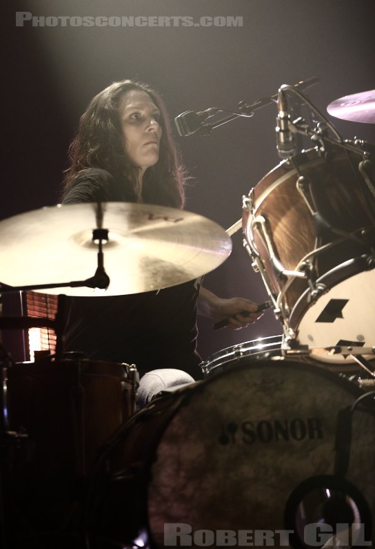Robert Levon Been (chant, bass et guitare) et Leah Shapiro (batterie, ex-The Raveonettes.) le rejoignent pour Shuffle Your Feet et sa curieuse intro vocale « Time won’t save our souls » répétée plusieurs fois a cappella. Robert joue de la guitare et porte une espèce de manteau gabardine long dont on se demande comment il peut le supporter dans la chaleur qui règne déjà dans l’Olympia au complet. Il le jette en coulisse après quelques chansons. Peter est toujours sous sa capuche et tire de longues plaintes blues et métalliques de sa guitare. Leah a pris du poids mais n’a pas perdu le rythme. Tout est en place, vous êtes au concert des Black Rebel Motorcycle Club, laissons-nous aller dans cette musique sombre et brute.